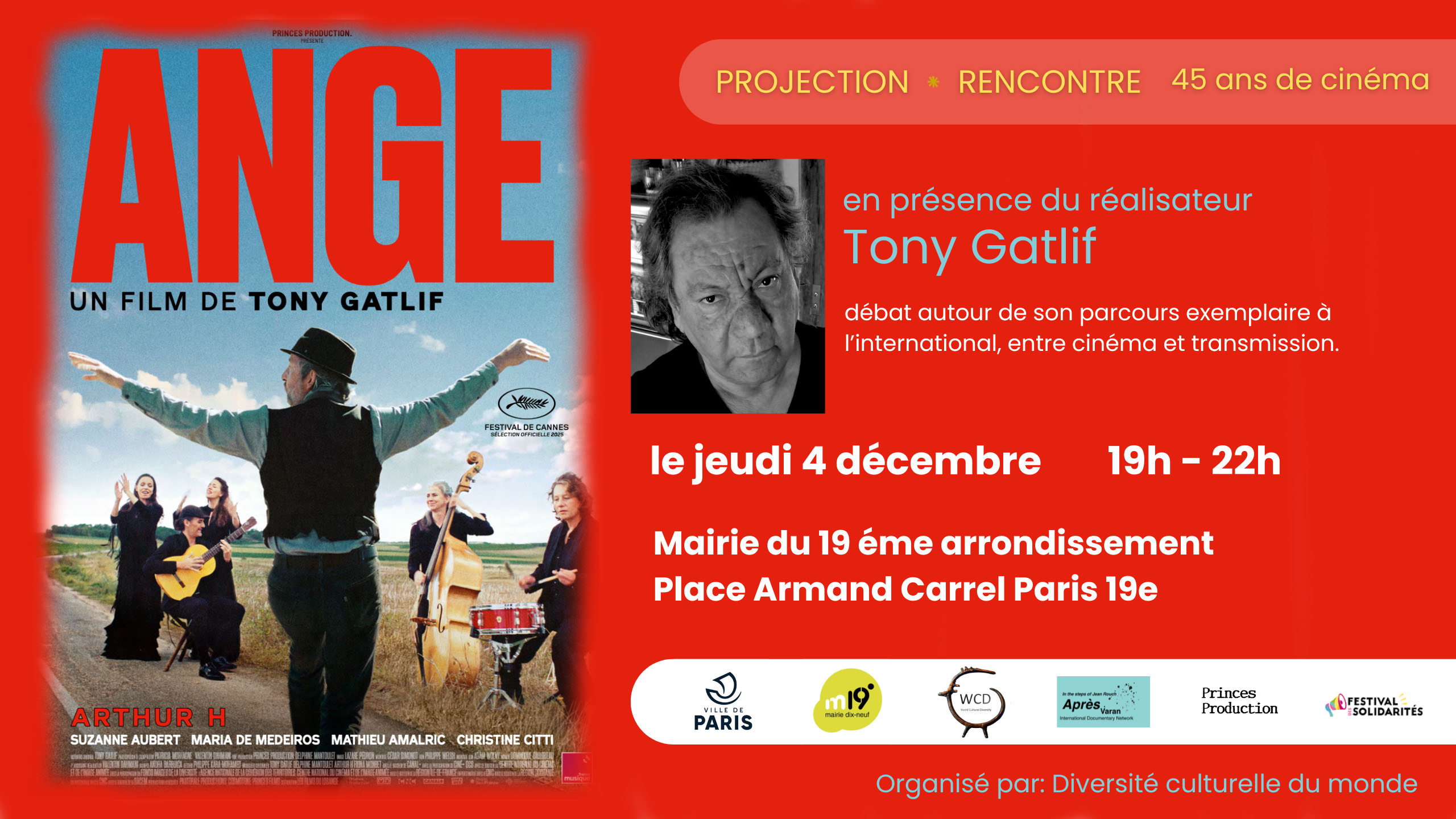 Projection du film « Ange » de Tony Gatlif. Un voyage poétique à travers danses et musiques du monde. Suivi d’un échange avec le réalisateur, Tony Gatlif, autour de son parcours exemplaire à l’international, 45 ans de cinéma et de transmission. Organisée Par l’Association Diversité culturelle du monde en partenariat avec Festival […]